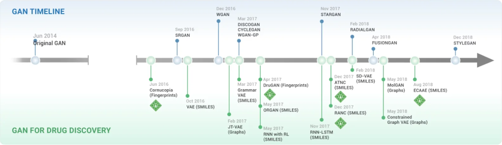 Sự ra đời của Mạng đối nghịch tạo sinh (GANs) bởi Ian Goodfellow vào năm 2014 đã mang lại một công cụ mạnh mẽ cho AI, cho phép máy móc “tưởng tượng” và tạo ra các phân tử hoàn toàn mới. Insilico Medicine là một trong những công ty tiên phong trong việc áp dụng công nghệ GANs để thiết kế các phân tử thuốc mới từ đầu (de novo).