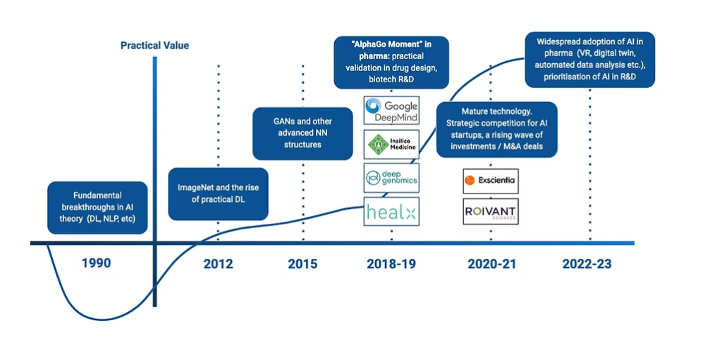 Bắt nguồn từ cuộc cách mạng deep learning, làn sóng các công ty khởi nghiệp AI-dược phẩm đã bùng nổ, tập trung chủ yếu vào việc phát triển các thuật toán tiên tiến (như GANs) để tăng tốc độ thiết kế và khám phá các phân tử thuốc mới.