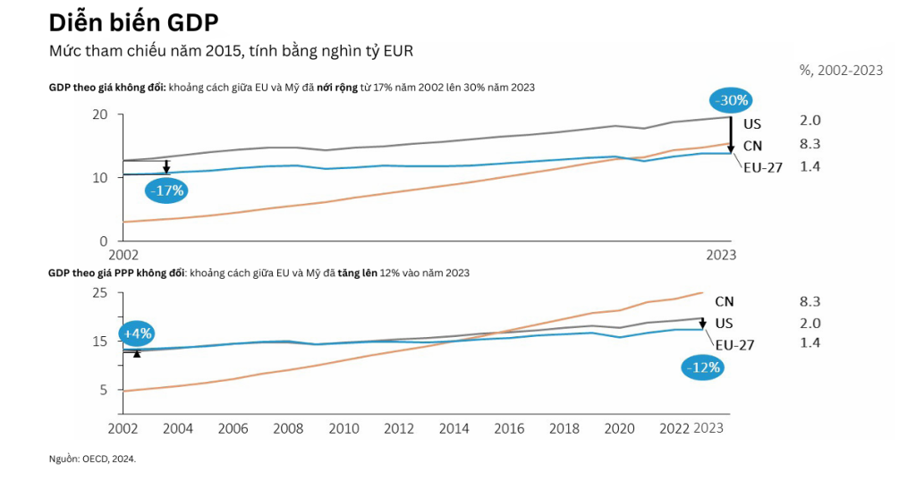Châu Âu đang đối mặt với một cuộc khủng hoảng, bị Hoa Kỳ bỏ lại phía sau về kinh tế (khoảng cách GDP ngày càng lớn) và công nghệ (thất bại trong việc đổi mới và thu hút vốn đầu tư mạo hiểm).