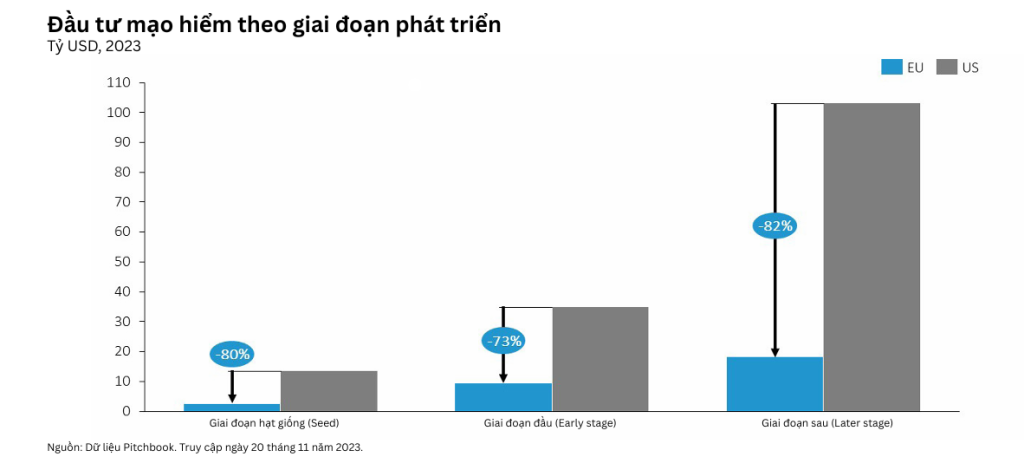 - Thu hẹp khoảng cách đổi mới sáng tạo: Châu Âu bị mắc kẹt trong một cấu trúc công nghiệp tĩnh, với ít công ty mới nổi lên để phá vỡ các ngành hiện có. Chi tiêu cho nghiên cứu và đổi mới (R&I) thấp hơn đáng kể so với Mỹ, và một vấn đề nghiêm trọng là châu Âu không thể chuyển đổi các ý tưởng sáng tạo thành các sản phẩm thương mại thành công. Báo cáo cho thấy gần 30% các công ty “kỳ lân” (startup trị giá trên 1 tỷ USD) được thành lập ở châu Âu đã chuyển trụ sở ra nước ngoài, phần lớn là sang Mỹ.