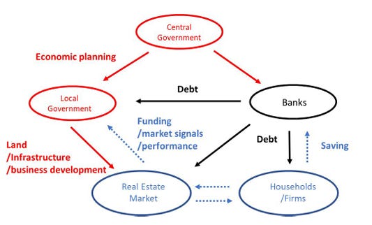 Hình trên mô tả thị trường bất động sản Trung Quốc – nơi sự kiểm soát của nhà nước và cơ chế thị trường tự do tồn tại song song và tương tác lẫn nhau (như cách chúng ta mô tả ở trên). Mô hình này được đặc trưng bởi sự phân chia vai trò rõ rệt: