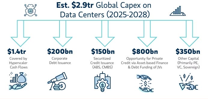Chi tiêu vốn (capex) cho cơ sở hạ tầng AI đã đạt đến quy mô khổng lồ. Các công ty như Microsoft, Google, Amazon và Meta đang đầu tư hàng chục tỷ đô la mỗi quý vào việc xây dựng và mở rộng các trung tâm dữ liệu. Morgan Stanley dự báo rằng chỉ riêng việc xây dựng các trung tâm dữ liệu mới trên toàn cầu sẽ tiêu tốn khoảng 2,9 nghìn tỷ đô la trong giai đoạn 2025-2028, một con số chưa bao gồm chi phí năng lượng vận hành. Động lực chính của khoản chi này là nhu cầu về các bộ xử lý đồ họa (GPU) hiệu năng cao từ Nvidia, công ty đã chứng kiến doanh thu tăng trưởng theo cấp số nhân.