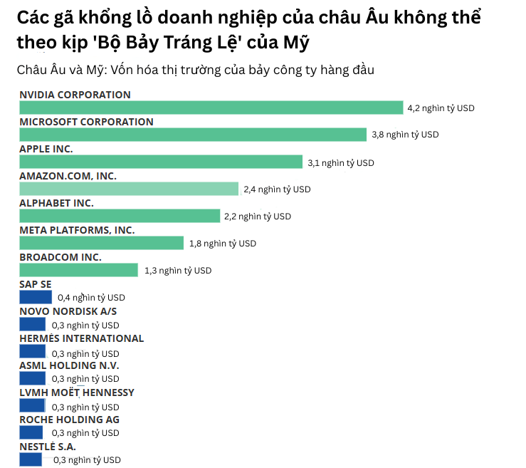 Châu Âu đang tụt hậu đáng kể so với Hoa Kỳ về tăng trưởng kinh tế, thu nhập bình quân đầu người và giá trị của các công ty hàng đầu, đặc biệt trong lĩnh vực công nghệ nơi “Bộ Bảy Tráng Lệ” của Mỹ có giá trị vượt xa các đối tác châu Âu.