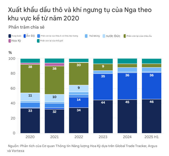 Chính sách hai mặt này đã tạo ra những gợn sóng trên thị trường. Khi Ấn Độ giảm nhẹ việc mua hàng do áp lực thuế quan, các nhà máy lọc dầu của Trung Quốc đã “nhanh chóng nắm bắt cơ hội”, mua thêm các lô hàng dầu thô giảm giá của Nga được vận chuyển từ các cảng thường dành cho Ấn Độ.