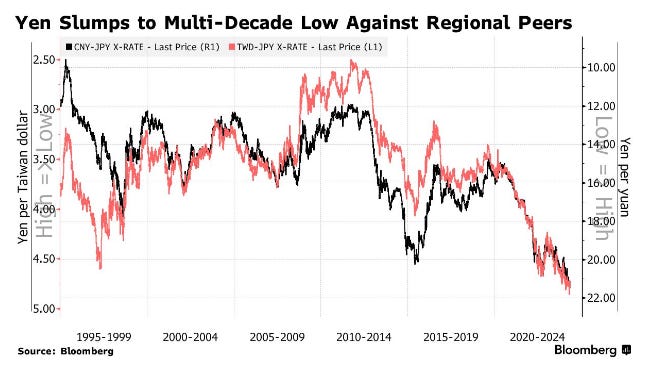 Đồng Yên đã giảm xuống các mức thấp kỷ lục so với không chỉ đô la Mỹ mà còn so với các đồng tiền của các đối tác thương mại và đối thủ cạnh tranh chính trong khu vực, bao gồm cả Nhân dân tệ Trung Quốc, Won Hàn Quốc và Đô la Đài Loan. Một đồng Yên yếu hơn làm cho hàng hóa xuất khẩu của Nhật Bản trở nên rẻ hơn một cách tương đối trên thị trường toàn cầu.