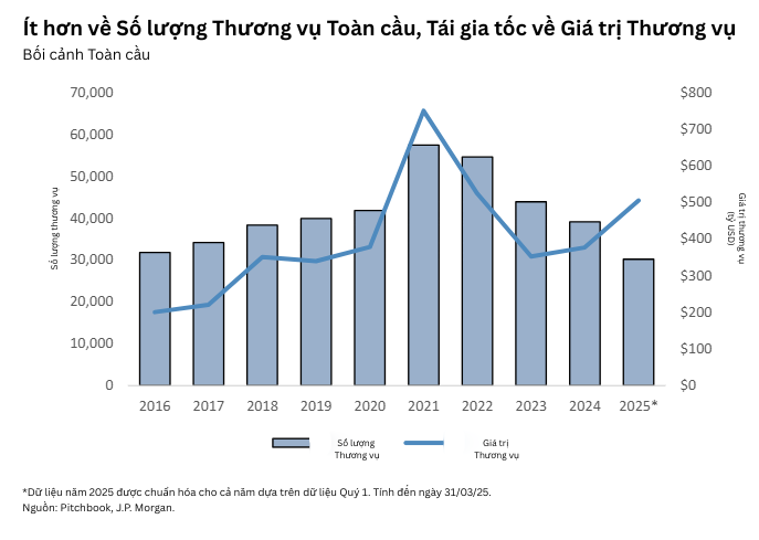 Dữ liệu từ nửa đầu năm 2025 cho thấy một trong những đặc điểm nổi bật nhất của thị trường hiện tại là sự phân kỳ rõ nét giữa tổng giá trị vốn đầu tư và tổng số lượng thương vụ. Trong khi số lượng các thương vụ trên toàn cầu có xu hướng giảm hoặc ổn định ở mức thấp hơn so với giai đoạn đỉnh cao 2021, tổng giá trị vốn giải ngân lại cho thấy sự phục hồi mạnh mẽ.