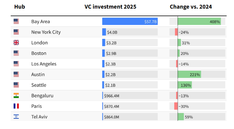 Sự thống trị của Hoa Kỳ càng được củng cố bởi sức mạnh của lĩnh vực công nghệ, đặc biệt là phần mềm và trí tuệ nhân tạo. Trong Quý 1/2025, Hoa Kỳ đã huy động được lượng vốn đầu tư mạo hiểm nhiều hơn 60 tỷ USD so với tổng của 10 quốc gia hàng đầu thế giới cộng lại. Sáu trong số mười trung tâm công nghệ hàng đầu thế giới về vốn VC trong quý này cũng thuộc về Hoa Kỳ. Sự tập trung này cho thấy hệ sinh thái công nghệ của Hoa Kỳ, với sự hiện diện của các tập đoàn công nghệ lớn, các quỹ đầu tư dồi dào và một thị trường vốn sâu, tiếp tục là mảnh đất màu mỡ nhất cho các công ty công nghệ có quy mô lớn.