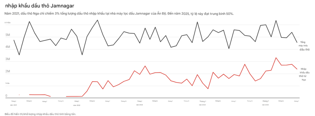 Khi Tổng thống Donald Trump áp đặt mức thuế quan lên tới 50% đối với Ấn Độ vì giúp “cung cấp tài chính cho cuộc chiến của Nga ở Ukraine”, sự chú ý đã đổ dồn vào vai trò trung tâm của tập đoàn Reliance Industries (RIL) do ông Ambani điều hành. Thương hiệu Reliance có mặt ở khắp mọi nơi tại Ấn Độ. Công ty, được thành lập bởi cha của ông Mukesh Ambani tại Bombay (nay là Mumbai) vào năm 1965 như một công ty kinh doanh polyester, là tập đoàn lớn nhất quốc gia, bao gồm các công ty thống trị trong lĩnh vực năng lượng, dữ liệu và mạng di động, bán lẻ, tài chính, và nhiều lĩnh vực khác. Các công ty này phát sóng HBO, sở hữu một trong những đội cricket giá trị nhất thế giới, điều hành một loạt các quỹ từ thiện, và gần đây họ đã thâu tóm gần như mọi thương hiệu thời trang cao cấp (haute couture) trong nước. Nhà máy lọc dầu Reliance tại Jamnagar được xếp hạng quốc tế trong nhóm hàng đầu về mức độ phức tạp. Có nhiều loại dầu thô khác nhau, và cơ sở Jamnagar có thể dễ dàng chuyển đổi từ việc lọc dầu thô từ Vịnh Ba Tư, Châu Mỹ Latinh hoặc bất cứ nơi nào có thể tìm được giá tốt nhất. Theo dữ liệu từ Trung tâm Nghiên cứu Năng lượng và Không khí Sạch (CREA), sự thay đổi trong hoạt động của RIL là vô cùng ấn tượng. Trước chiến tranh, dầu thô của Nga chỉ chiếm 3% lượng nhập khẩu của nhà máy lọc dầu Jamnagar. Đến năm 2025, con số này đã tăng vọt lên mức trung bình 50%. Chỉ trong bảy tháng đầu năm 2025, nhà máy này đã nhập khẩu 18,3 triệu tấn dầu thô của Nga, trị giá 8,7 tỷ USD.