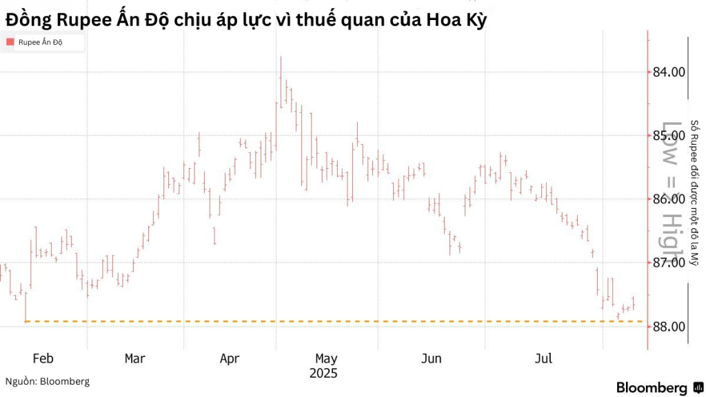 Nền kinh tế Ấn Độ đối mặt với nhiều biến động vào tháng 8/2025, điển hình trên thị trường ngoại hối – đồng Rupee (INR) lần đầu tiên trong lịch sử đã phá vỡ ngưỡng tâm lý 87.9763 INR đổi một đô la Mỹ (USD), thiết lập mức thấp kỷ lục mới. Sự sụt giảm đột ngột và mạnh mẽ này không chỉ mang ý nghĩa thống kê; nó phản ánh những áp lực kinh tế vĩ mô và địa chính trị phức tạp đang tác động lên nền kinh tế lớn thứ tư thế giới. Nguyên nhân trực tiếp và rõ ràng nhất của cuộc khủng hoảng tiền tệ này là quyết định của chính quyền Hoa Kỳ áp đặt thêm thuế quan trừng phạt đối với hàng hóa Ấn Độ, làm dấy lên lo ngại sâu sắc về triển vọng tăng trưởng, cán cân thương mại và sự ổn định tài chính của quốc gia Nam Á này.