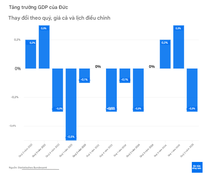 Nền kinh tế Đức đã suy giảm 0,3% trong quý II năm 2025, một mức sụt giảm nghiêm trọng hơn so với ước tính ban đầu, làm dấy lên lo ngại về sức khỏe của nền kinh tế lớn nhất châu Âu. Con số này là một sự điều chỉnh giảm đáng kể so với ước tính sơ bộ là -0,1% và đảo ngược mức tăng trưởng 0,3% được ghi nhận trong quý đầu tiên của năm.
