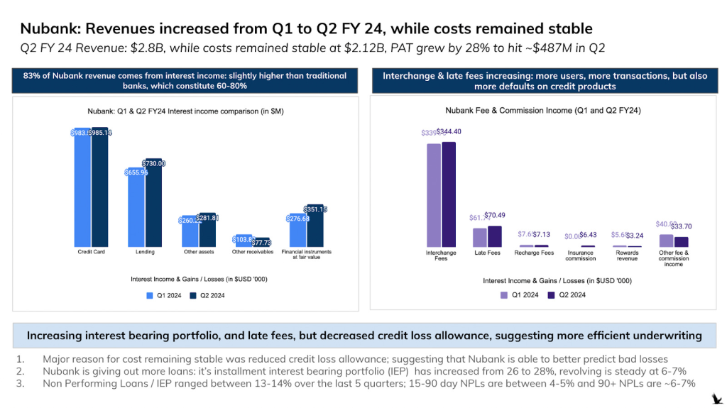 Về nguồn doanh thu chính, chúng ta có thể nhìn vào Nubank, neobank được coi là “tiêu chuẩn vàng” ở Mỹ Latinh. Mặc dù có nền tảng công nghệ vượt trội, 65% doanh thu của Nubank đến từ thu nhập lãi ròng (Net Interest Income) – tức là lợi nhuận từ hoạt động cho vay. Năng lực cốt lõi của họ không chỉ là công nghệ mà còn là quản lý rủi ro tín dụng, một chức năng ngân hàng kinh điển. Các neobank hàng đầu của Anh như Monzo và Starling thậm chí còn phụ thuộc nhiều hơn vào thu nhập lãi ròng, chiếm lần lượt hơn hai phần ba và hơn 90% doanh thu. Đây rõ ràng là mô hình kinh doanh của một ngân hàng, không phải của một công ty phần mềm (SaaS).