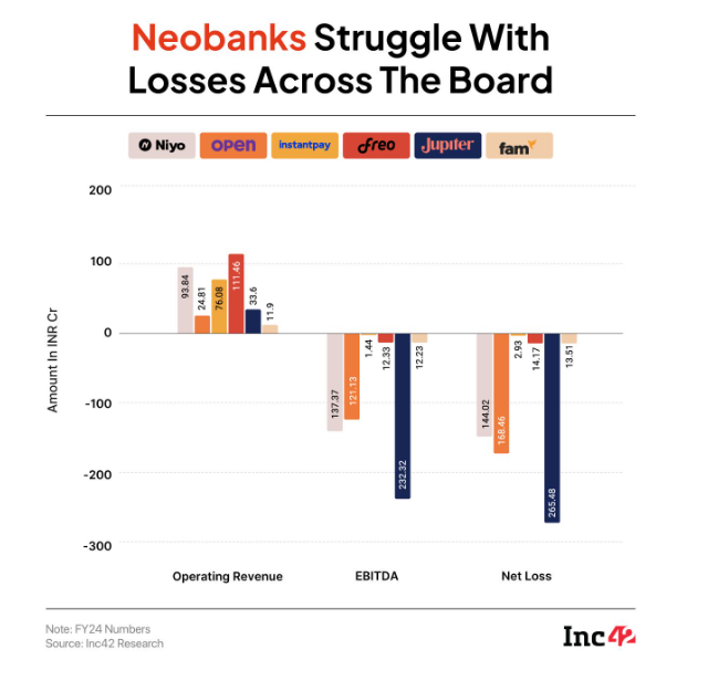 Thực tế tài chính đã cho thấy những khó khăn mà các neobank Ấn Độ đang đối mặt. Mặc dù thu hút được lượng lớn người dùng ban đầu, việc chuyển đổi người dùng thành doanh thu có lợi nhuận là một thách thức lớn. Các báo cáo tài chính cho thấy các công ty hàng đầu trong lĩnh vực này đang phải chịu các khoản lỗ đáng kể so với doanh thu. Ví dụ, trong năm tài chính 2024, Jupiter báo cáo khoản lỗ ròng 276 Cr INR trên doanh thu 35,8 Cr INR, trong khi Open lỗ 169,6 Cr INR trên doanh thu 24,8 Cr INR.