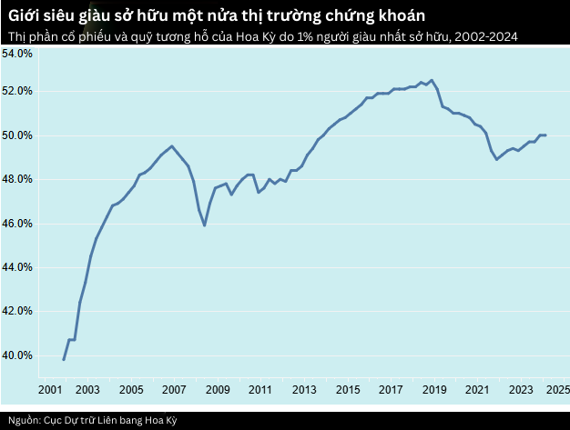 - Nhóm 1% giàu nhất: Nắm giữ tới 50% tổng giá trị cổ phiếu do các hộ gia đình sở hữu. Con số này thể hiện sự gia tăng đáng kể so với mức 40% vào năm 2002.