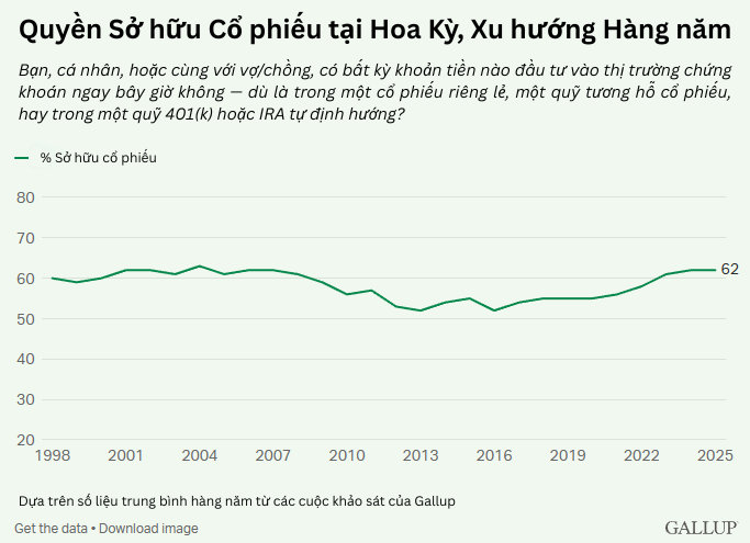 Thường có một luận điểm cho rằng thị trường chứng khoán đang được “dân chủ hóa” khi ngày càng có nhiều người tham gia. Dữ liệu của Gallup cho thấy khoảng 62% người trưởng thành ở Hoa Kỳ có sở hữu cổ phiếu dưới một hình thức nào đó, chủ yếu là gián tiếp thông qua các kế hoạch hưu trí như 401(k) hoặc các quỹ tương hỗ. Con số 162 triệu người tham gia thị trường có vẻ ấn tượng.