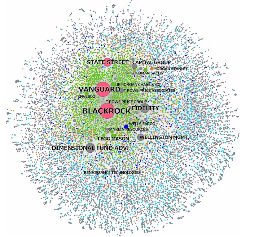 Sự tập trung quyền sở hữu ở cấp độ hộ gia đình còn được phản ánh ở cấp độ thể chế. Sự trỗi dậy của các quỹ đầu tư thụ động (quỹ chỉ số) đã dẫn đến sự tập trung quyền lực chưa từng có vào tay một số ít các công ty quản lý tài sản khổng lồ. Các công ty BlackRock, Vanguard và State Street, thông qua các quỹ chỉ số mà họ quản lý, đã trở thành cổ đông lớn nhất trong hầu hết các công ty niêm yết lớn nhất của Hoa Kỳ. Một nghiên cứu năm 2017 cho thấy họ là cổ đông lớn nhất trong 40% tất cả các công ty niêm yết tại Hoa Kỳ và trong gần 90% các công ty thuộc chỉ số S&P 500.