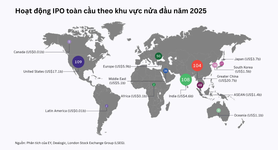 Bức tranh thị trường IPO toàn cầu cho thấy sự phân hóa rõ rệt giữa các khu vực. Trong khi châu Á-Thái Bình Dương và Trung Đông ghi nhận sự tăng trưởng mạnh mẽ, châu Mỹ duy trì sự ổn định, thì châu Âu lại sụt giảm đáng kể.