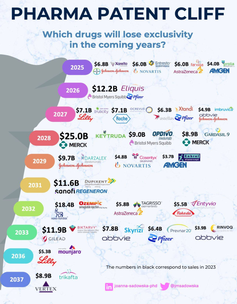 Giai đoạn từ nay đến năm 2030 được xác định là một trong những kỳ “vách đá bằng sáng chế” có quy mô lớn nhất trong lịch sử ngành. Ước tính có tới hơn 200 tỷ đô la doanh thu hàng năm của các công ty dược phẩm lớn đang đứng trước nguy cơ bị ảnh hưởng khi một loạt các sản phẩm bom tấn mất đi sự bảo hộ độc quyền.